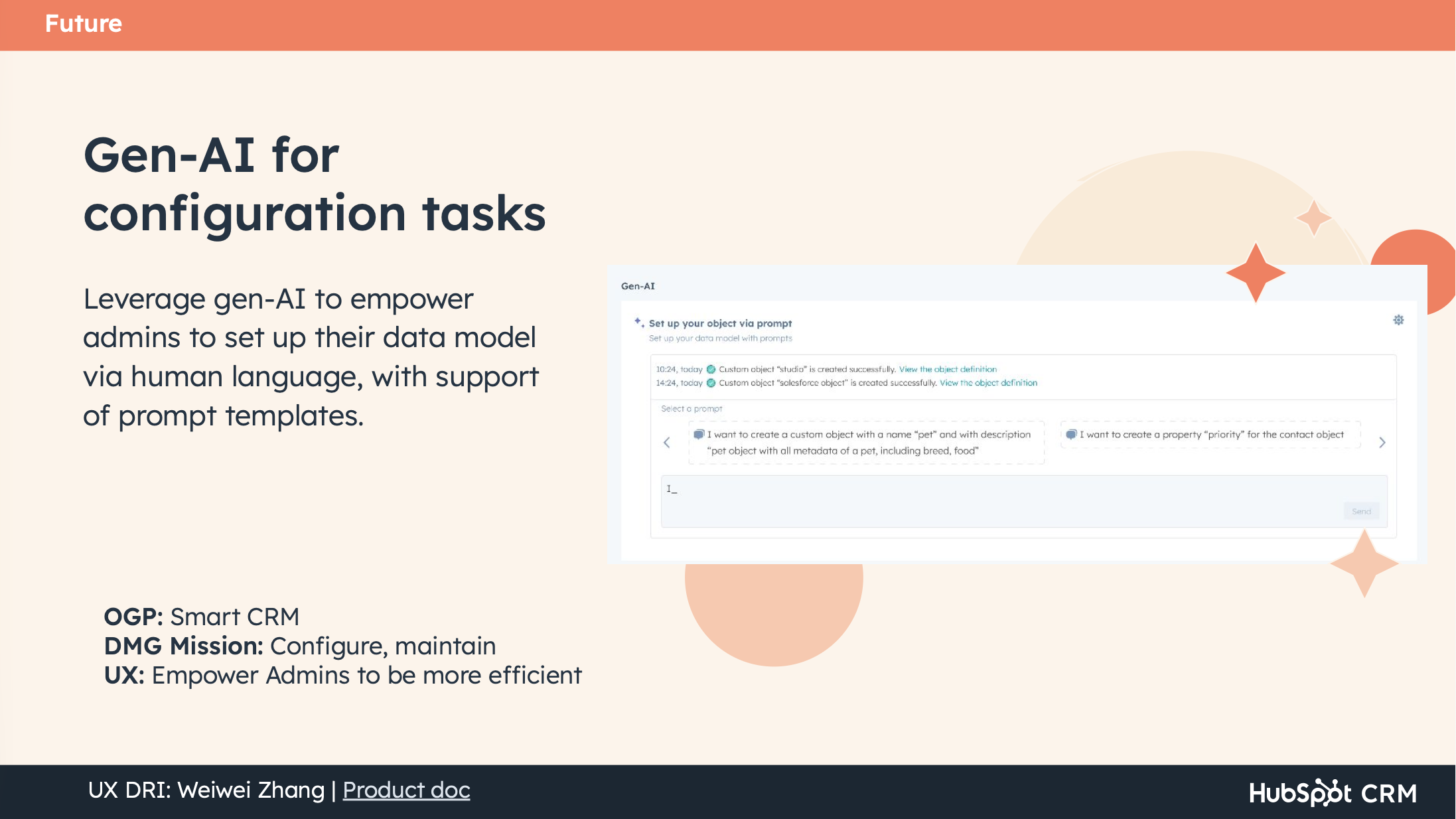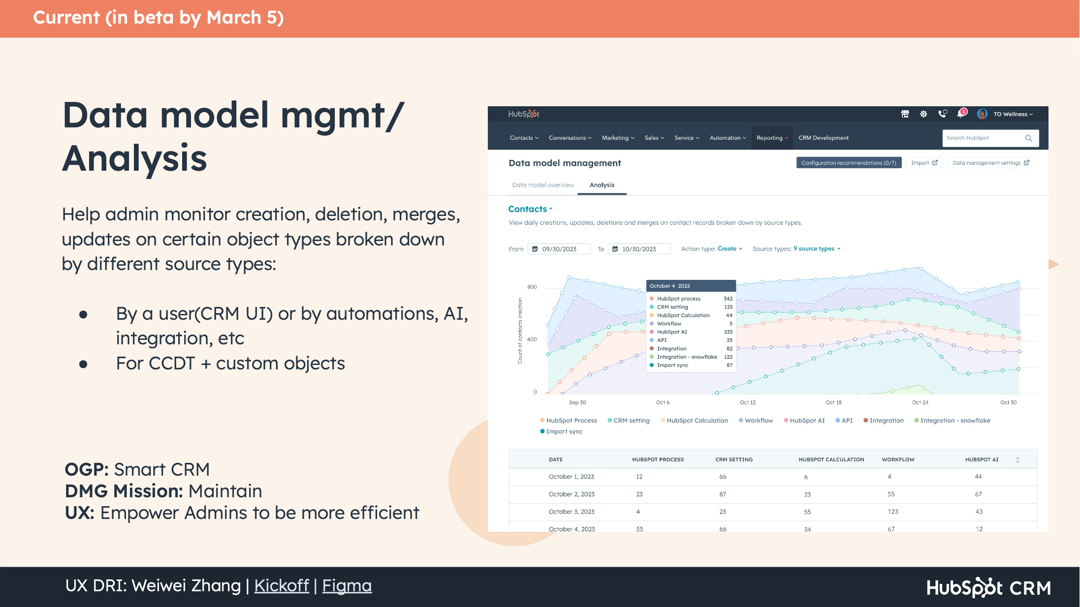 I anchored the vision directly to HubSpot's 2024 product strategy — specifically the Smart CRM's five core principles and the Data Management OGP goals. This wasn't decorative alignment; it was how I built credibility and buy-in with product and engineering leads. I introduced a prioritization lens borrowed from the product strategy: focus on adoption blockers, sprinkle in delight drivers. This gave the team clear permission to invest in foundational work (sensitive data, governance, permissions) before chasing differentiating features.