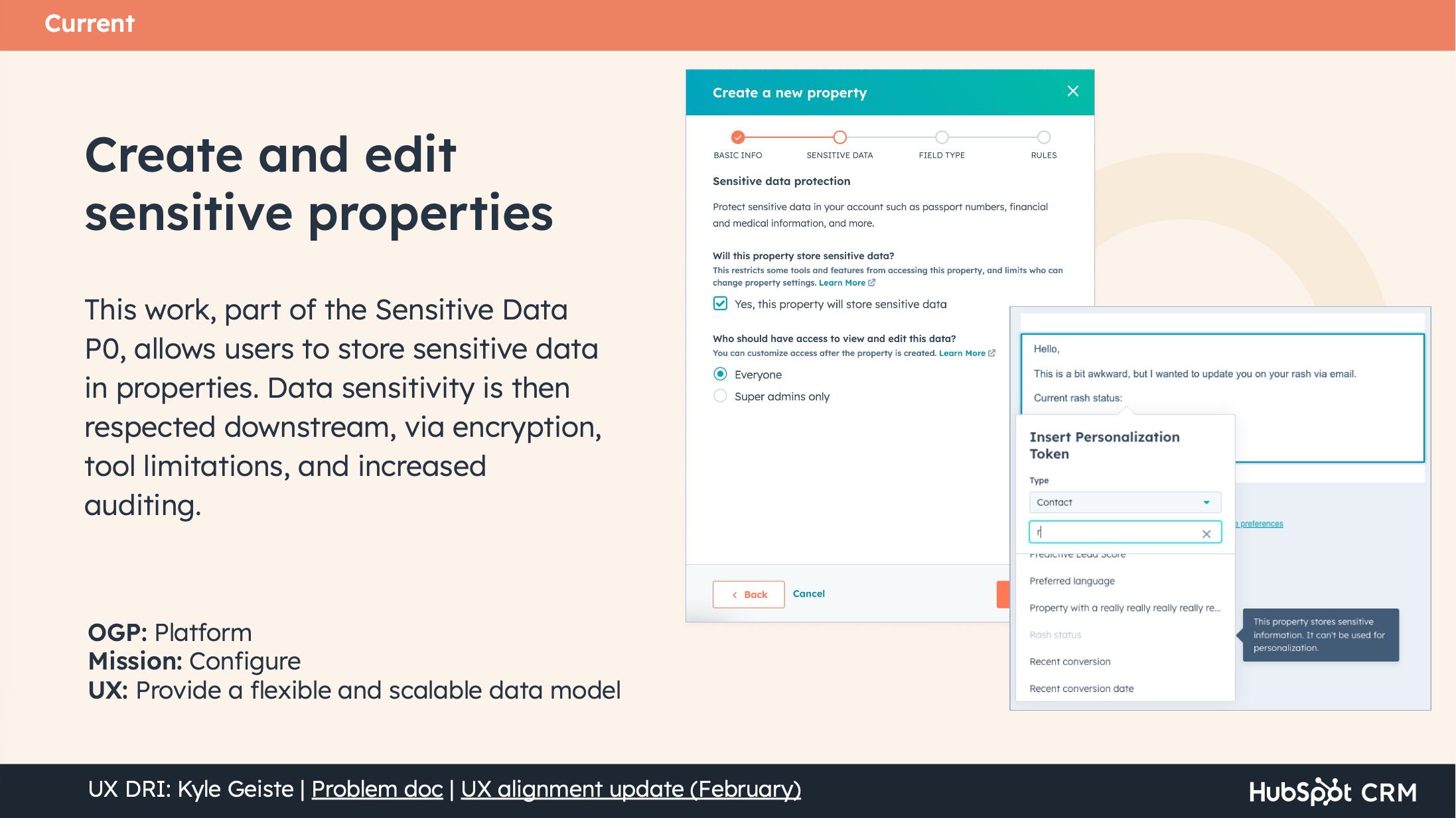 The "Current" phase work shipped as planned: sensitive data properties launched at Inbound 2025, sync properties moved from private beta to GA, and the property create/edit overhaul rolled out across all tiers. The near-term initiatives — custom date+time properties, configuration recommendations, data model templates, and usage limits — were scoped and staffed based on the vision's prioritization framework. The vision continued to serve as the team's strategic guide after my departure, with several "Future" concepts (the data management workspace, settings IA restructure) entering active development in subsequent planning cycles.