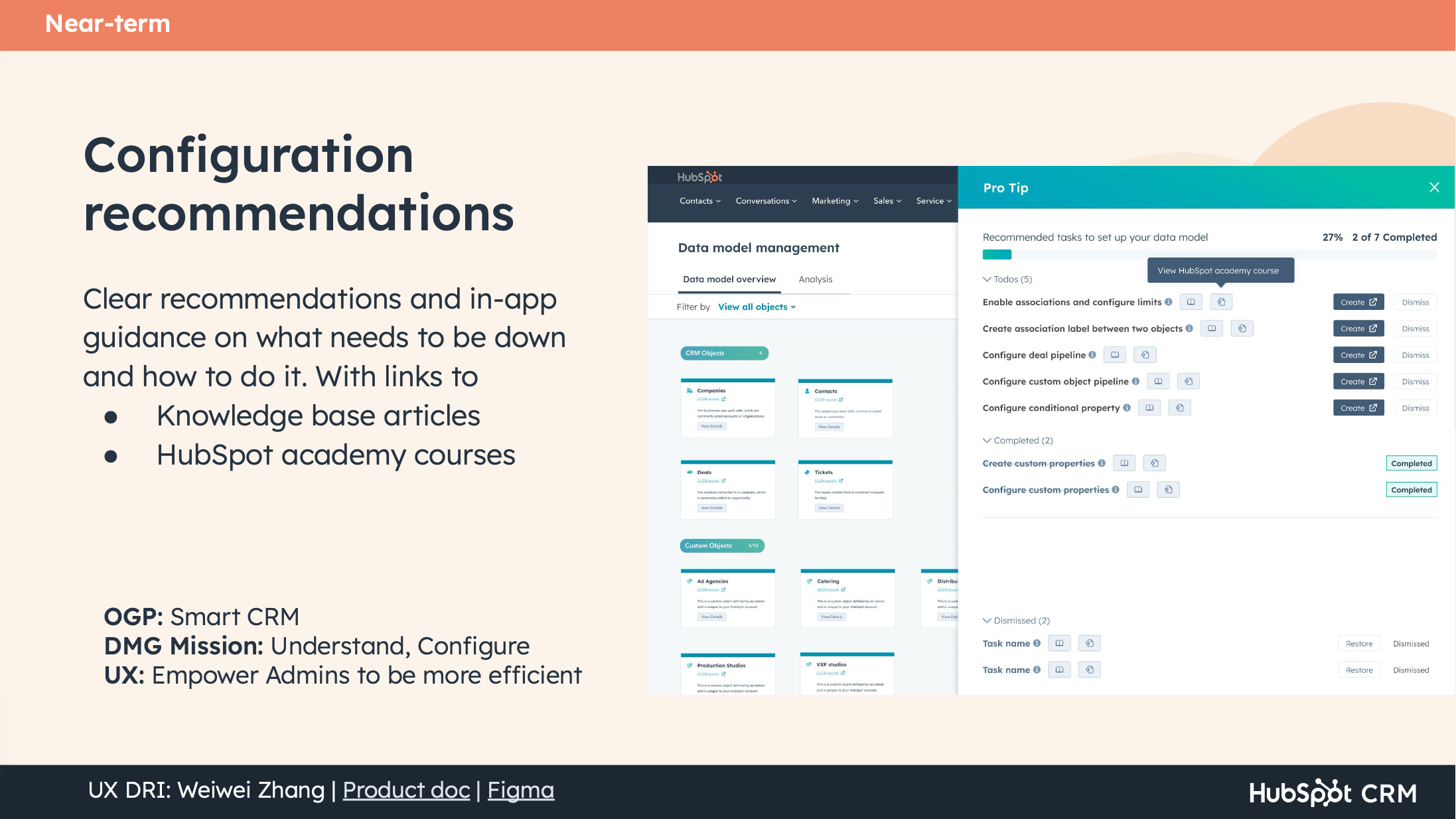 HubSpot was pushing upmarket — targeting companies with 200 to 2,000+ employees who needed extensive customization, stricter governance, and more complex data models. But the CRM experience hadn't evolved to match. Admins were struggling across three connected phases of their journey: understanding the platform's logic, configuring it for their org, and maintaining data health over time.