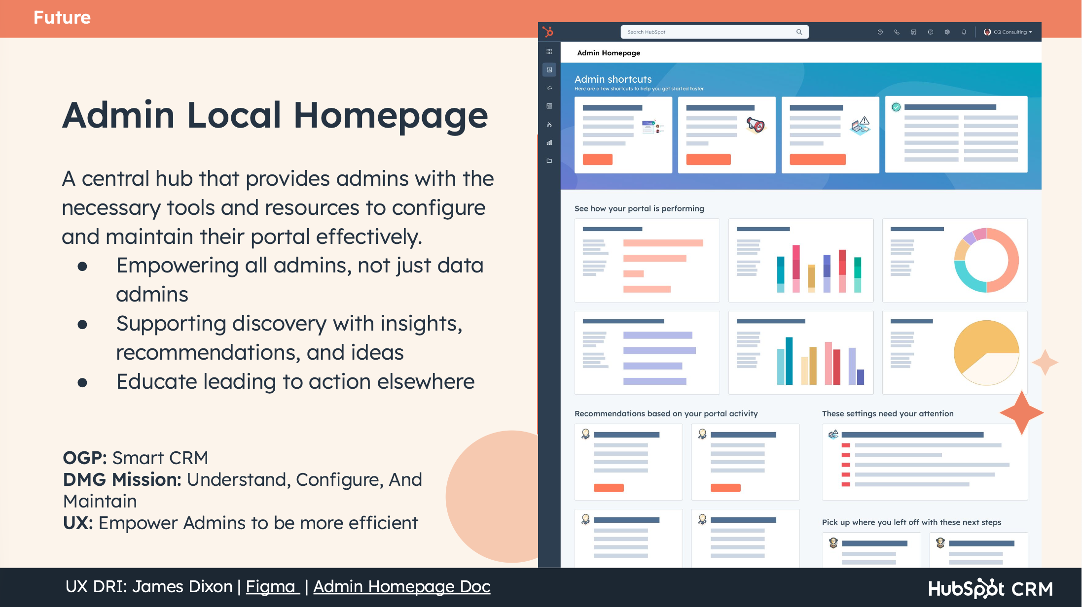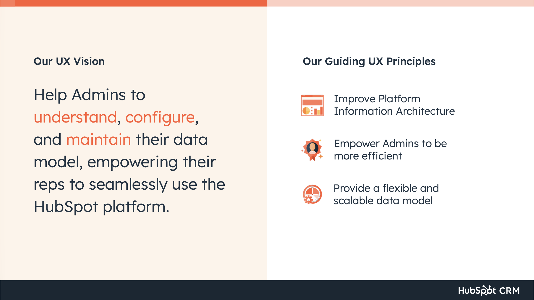 This was my first time leading a full UX vision from initiation to socialization at HubSpot. The thing that worked best was the Understand / Configure / Maintain framework — it gave us a shared language that product managers and engineers could use in their own planning, which is the real test of whether a design framework has legs.