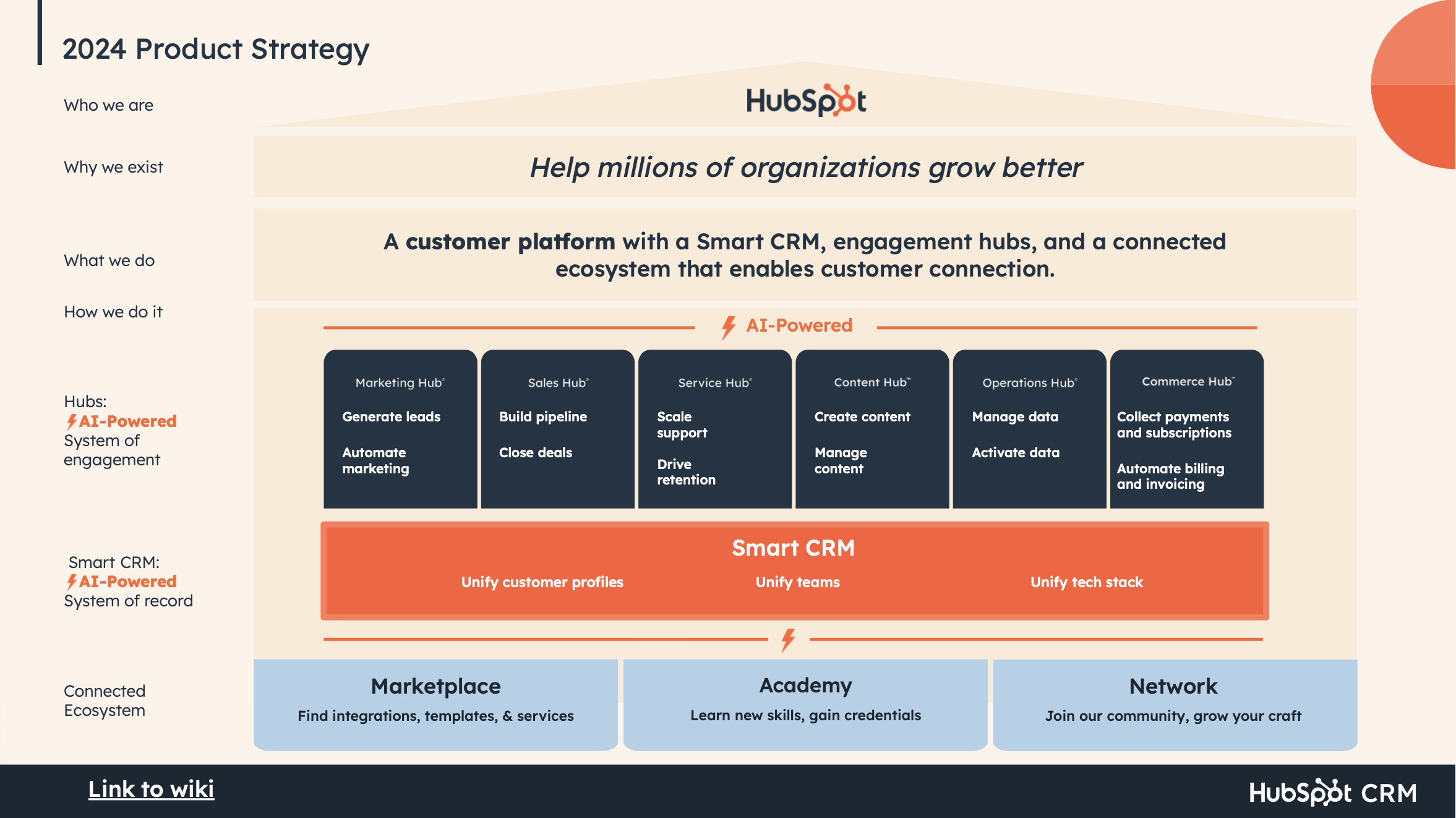 HubSpot's 2024 product strategy centered on a major bet: transforming from a collection of marketing and sales tools into a true customer platform anchored by a "Smart CRM." The CRM mission was clear — become the #1 CRM for scaling businesses. My team's mission laddered directly into that: help more complex companies map their business data and processes inside HubSpot.