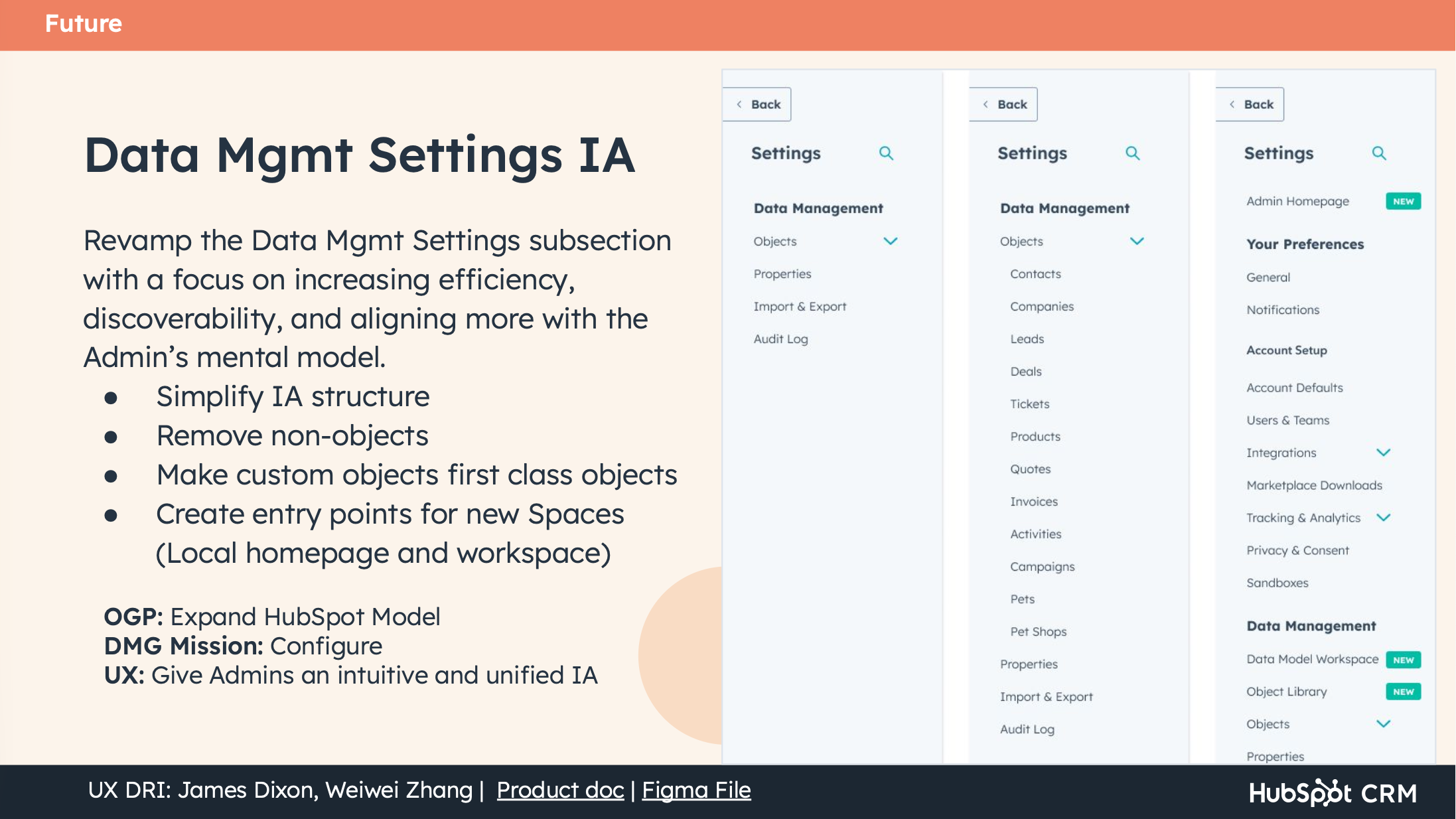 I'd also push for more cross-team vision work earlier. Several of our "Future" concepts — particularly the admin homepage and settings IA — had dependencies on teams outside Data Management. Starting those conversations during the vision process rather than after would have accelerated alignment.